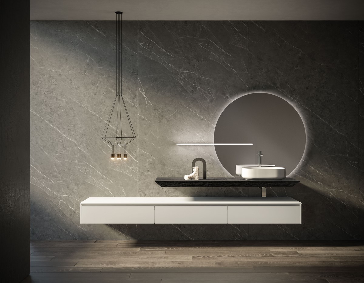 Linee rigorose, volumi sospesi e una palette cromatica profonda: questa composizione bagno è l’incontro tra geometria e materia. Il grande specchio retroilluminato dialoga con la mensole luminosa, mentre il top impiallacciato EDON CARBON con taglio a 45° e il lavabo d’appoggio creano un contrasto sofisticato.