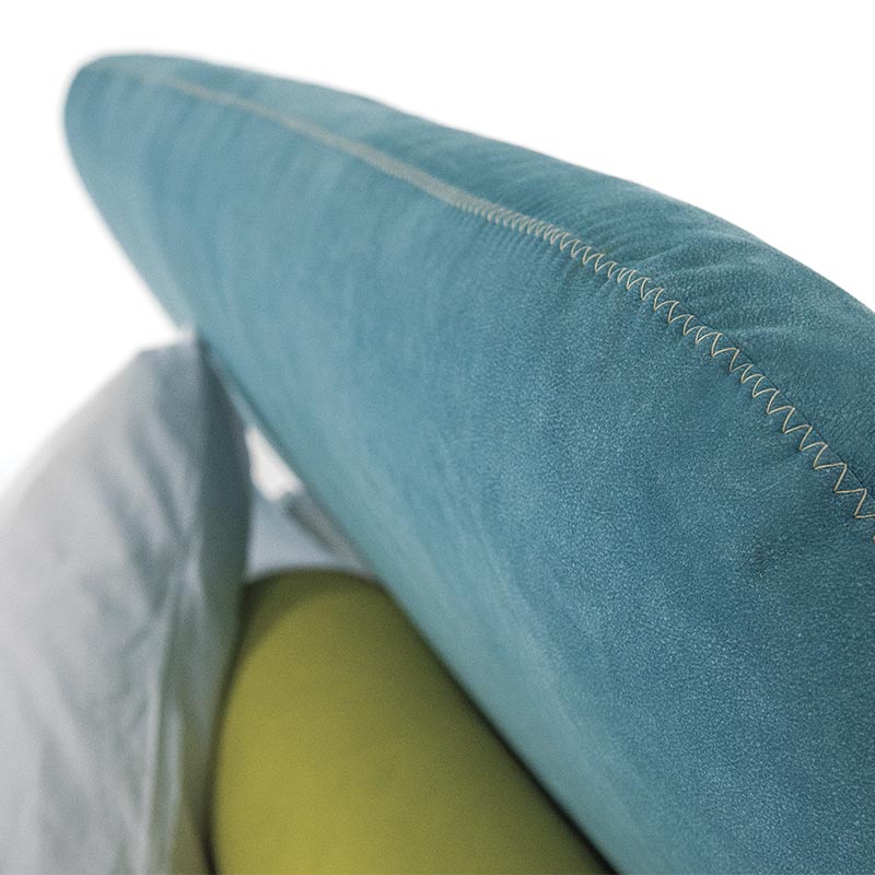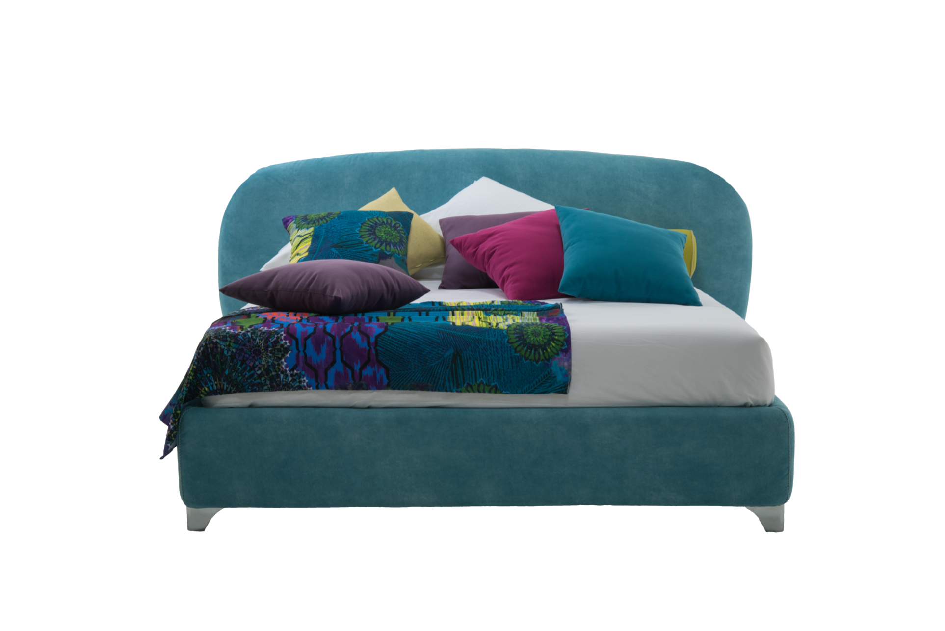 Con un design decisamente anni sessanta, il letto Frank si presenta dalle forme bombate e morbide, con il dettaglio della cucitura a contrasto presente sulla testata e sul giroletto, e un originale piede in acciaio