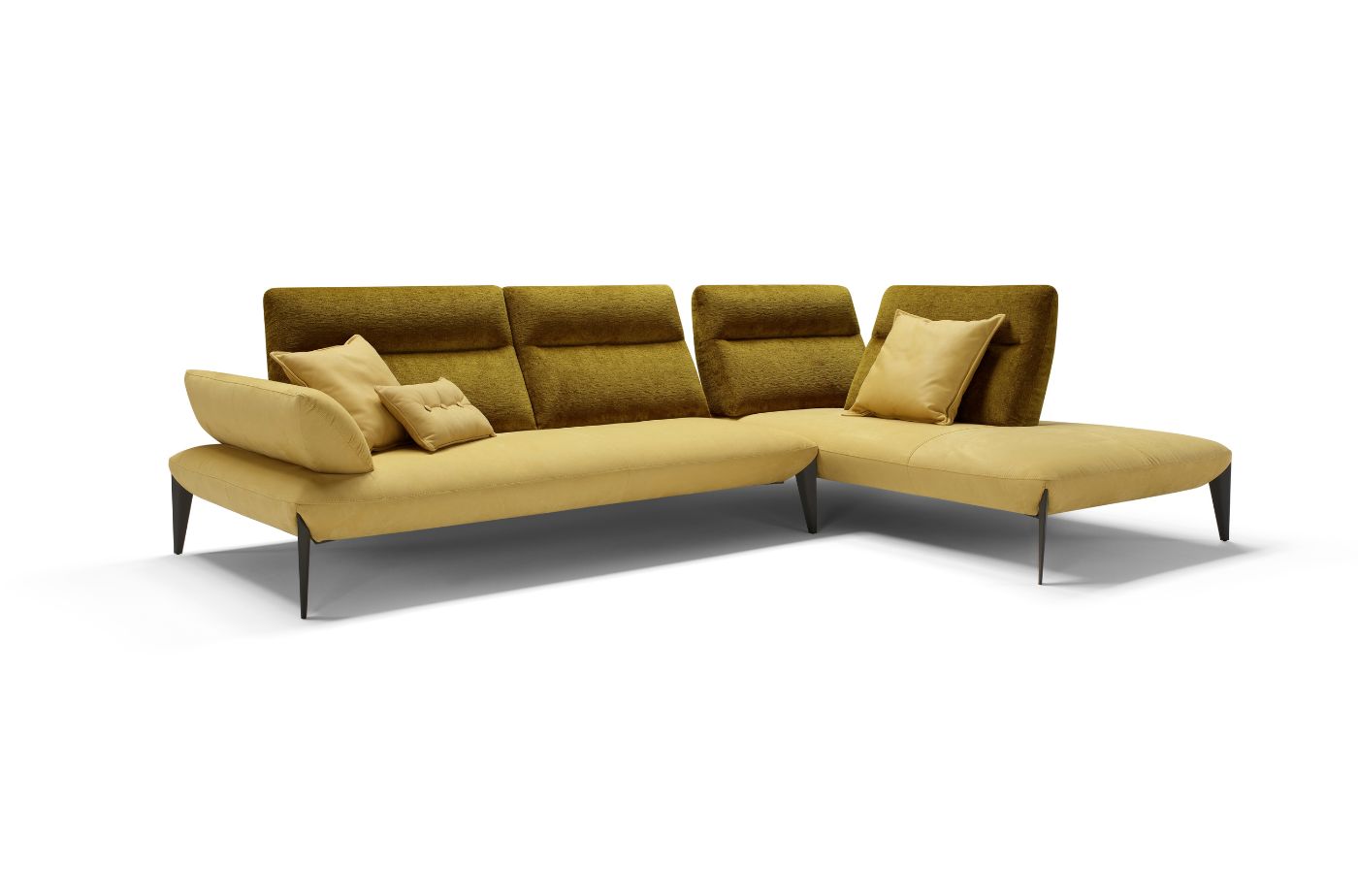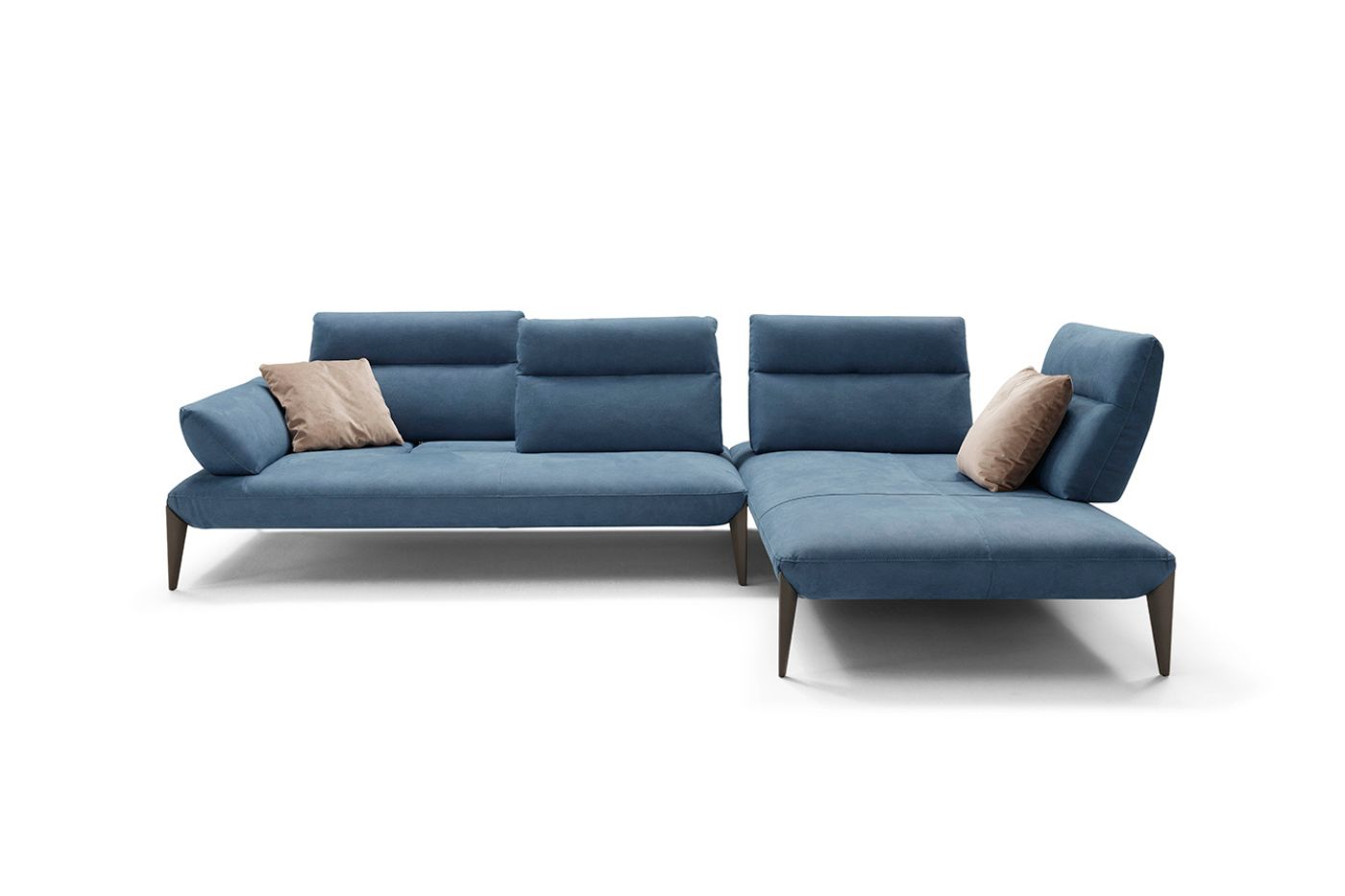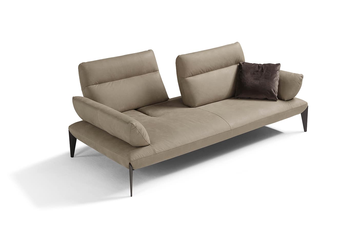 piedini in metallo dalla forma geometrica e rigorosa slanciano il divano giocando con le linee diagonali della seduta. Gli schienali basculanti con meccanica manuale permettono di aumentare in modo notevole la profondità di seduta, garantendo il relax desiderato.