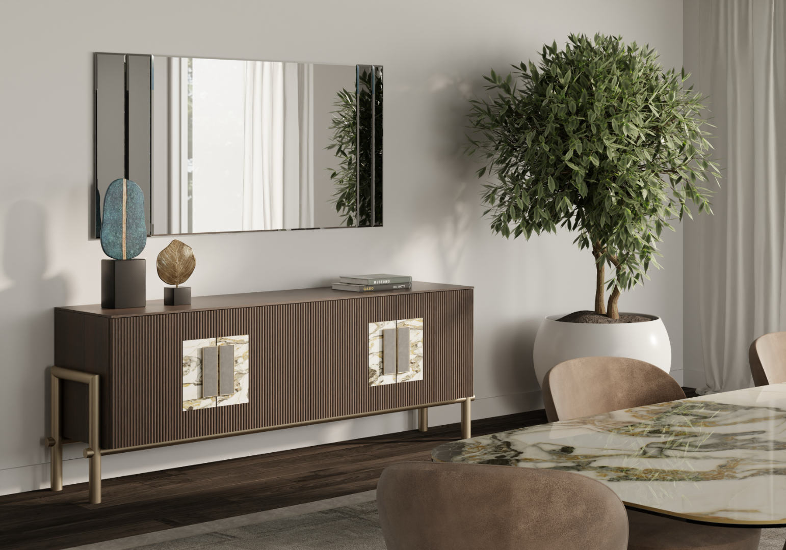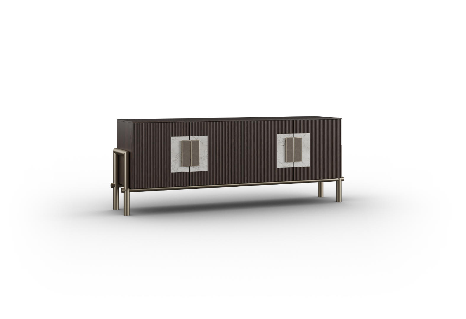 Versione Bronzo: basamento bronzo, cassa in noce canaletto, ante canettate con inserto in ceramica lucida calacatta oro venato.