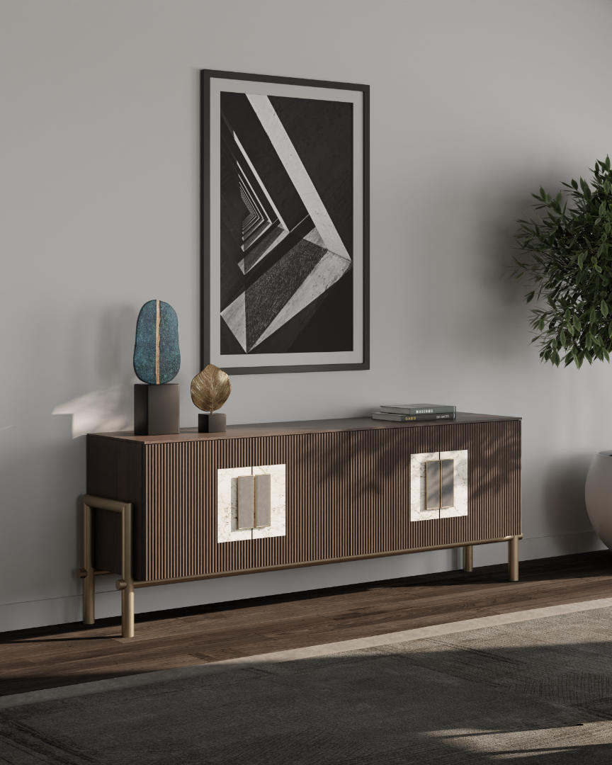 Lena è una madia dal design elegante e contemporaneo, caratterizzata da linee pulite e dettagli di pregio. L’elemento distintivo sono le ante canettate in legno massello abbinate a inserti in ceramica, che creano un contrasto raffinato tra materiali naturali e superfici lucide.