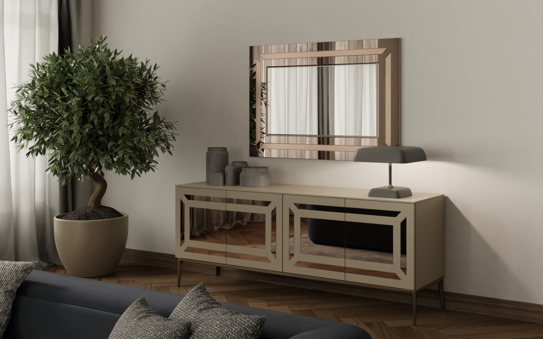 Specchio rettangolare con supporto in MDF e vetro sabbiato/specchiato bronzato o fumé.